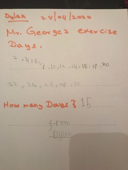 A very well done to Dylan & Daniel. They both worked it out brilliantly. You can see the way they worked it out in the photos below. Dylan has also worked out on what days and how many times I will do my exercises in May. I've got a lot to do!