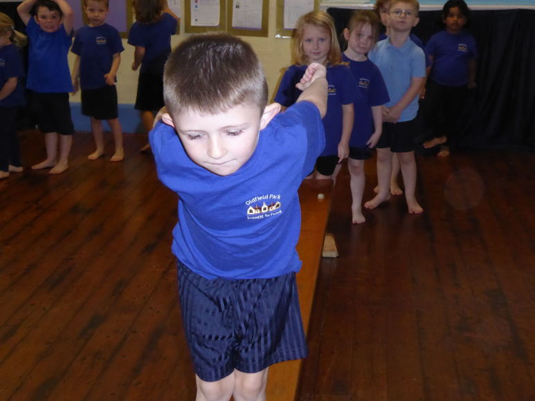 In PE today we had the benches out. We had to travel along the bench, walking tall like a gymnast, and do a controlled jump on to the mat at the end. We had to have 'squidgy knees' (nice bent knees) when we jumped and landed. Most of us could land on our two feet without falling on to the mat! We were getting very controlled by the end of it!