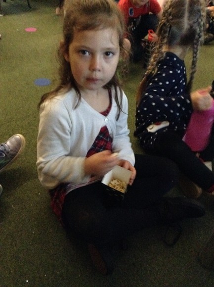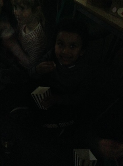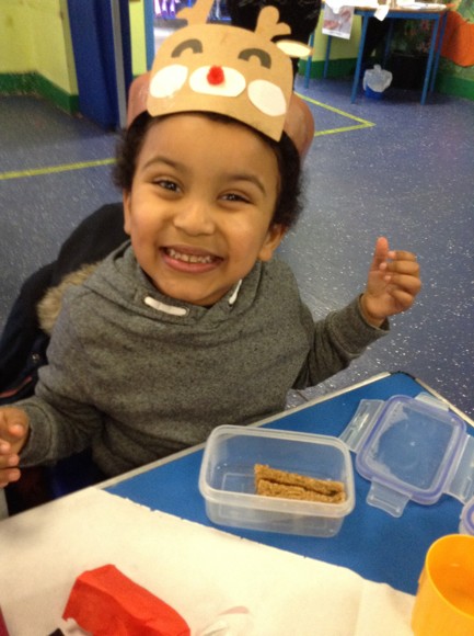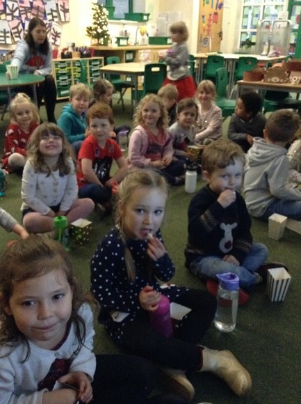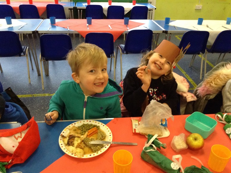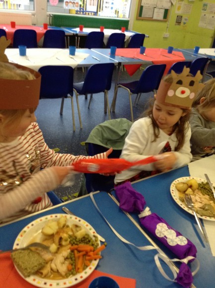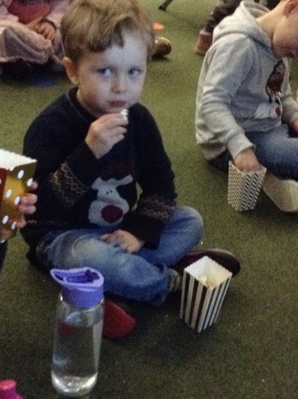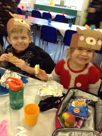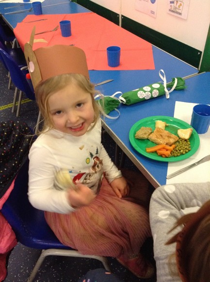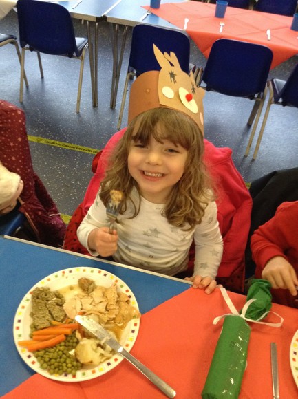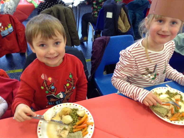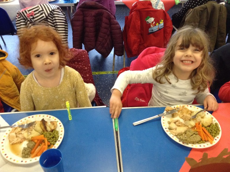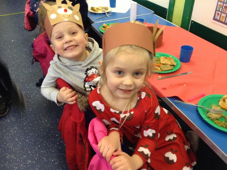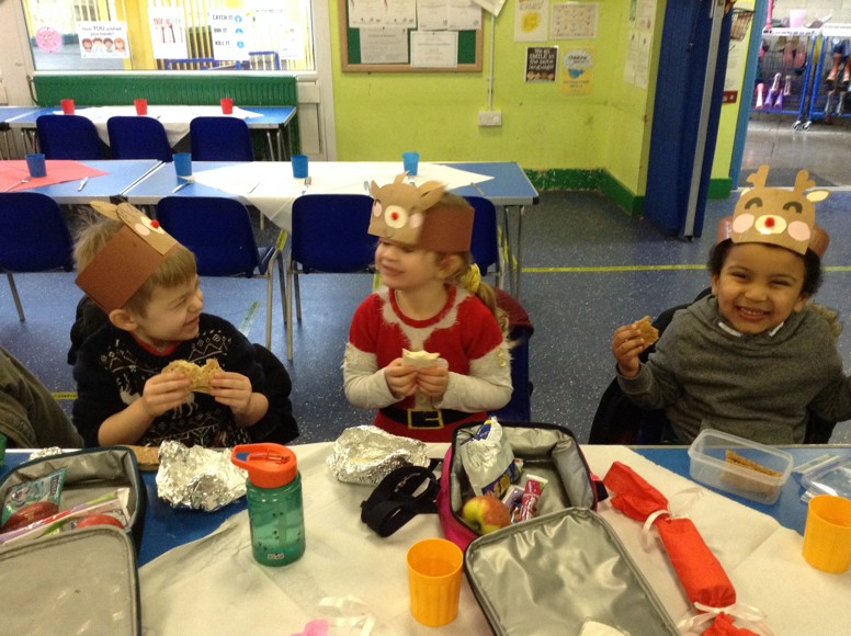 Yesterday we enjoyed Christmas dinner in the Hive. We wore our reindeer hats that we'd made and we had fun pulling our crackers with our friends. In the afternoon, we watched a theatre show called Boing! and we even had some popcorn!