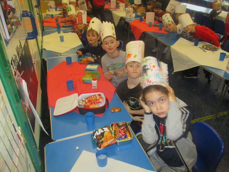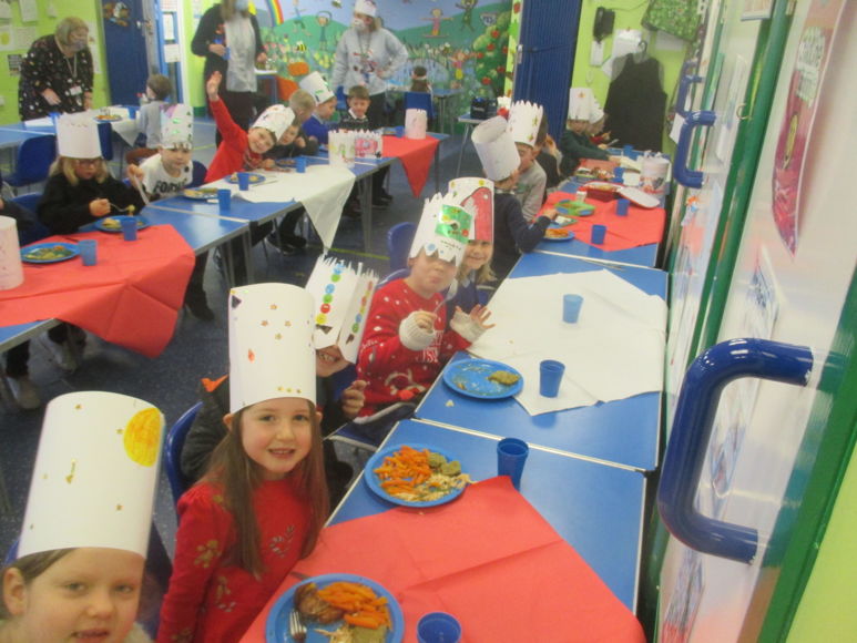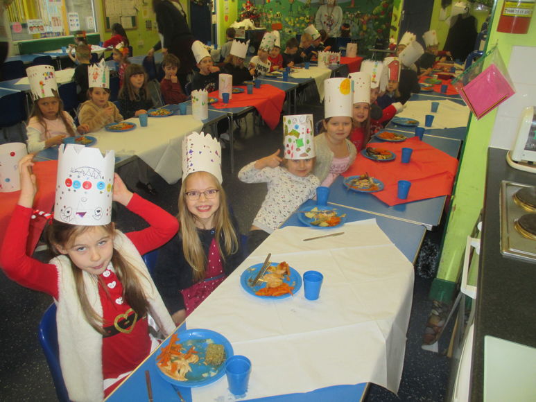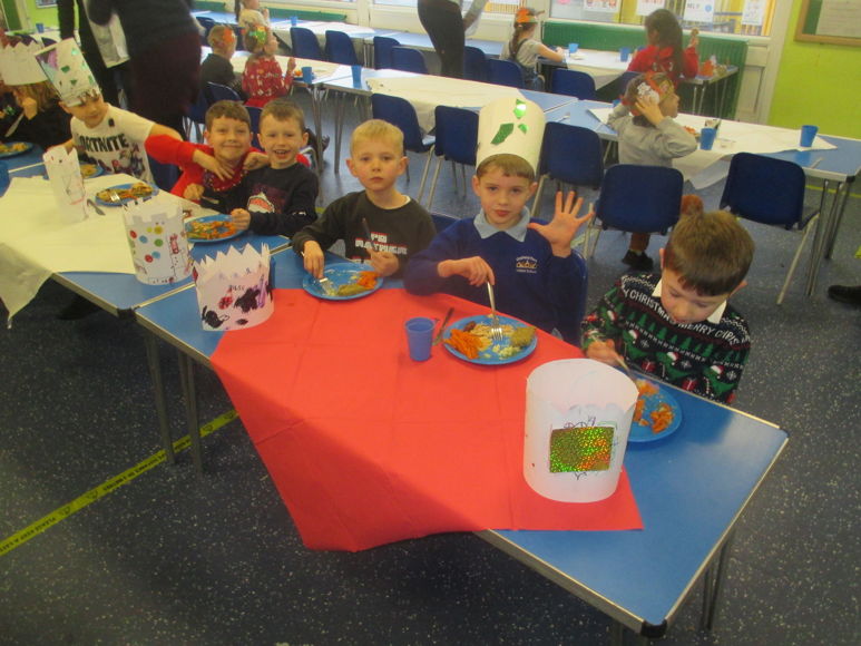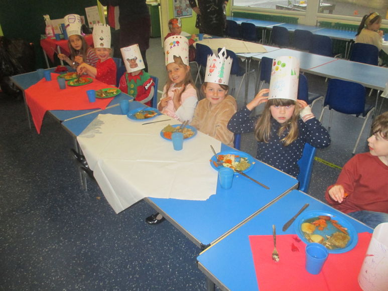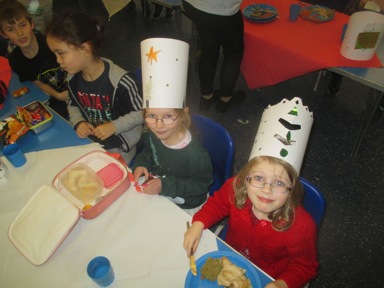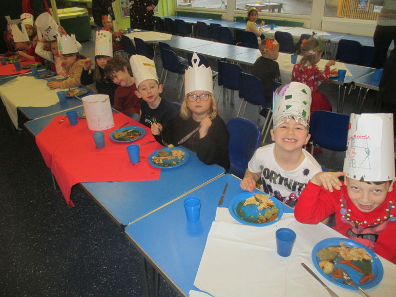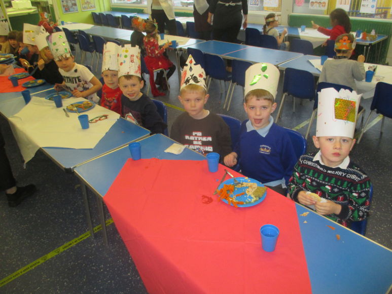 Here we all are enjoying a Christmas dinner in our party hats.