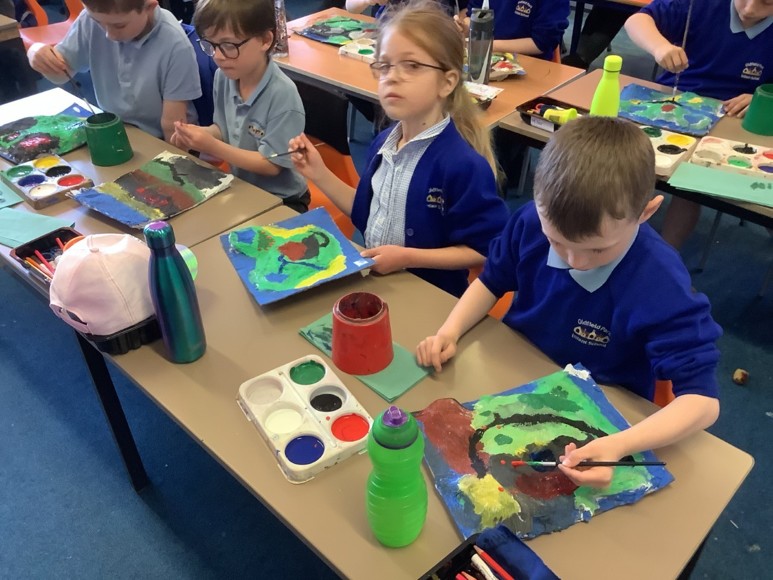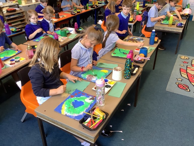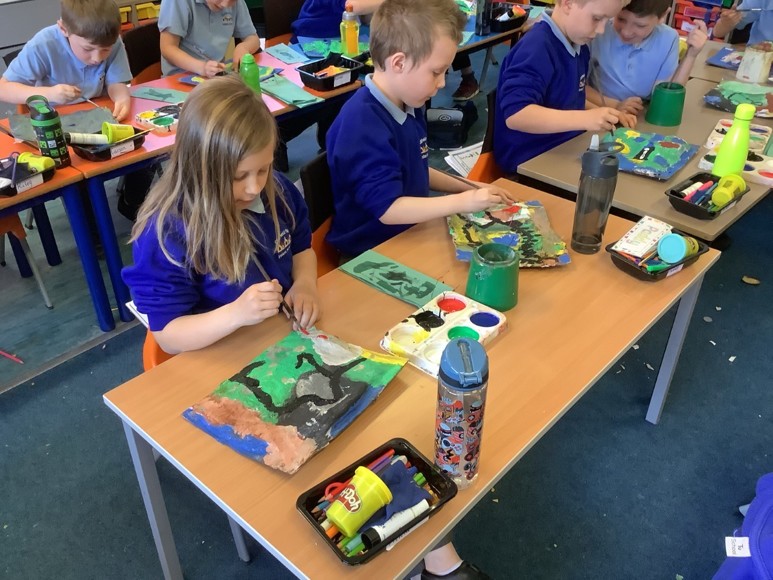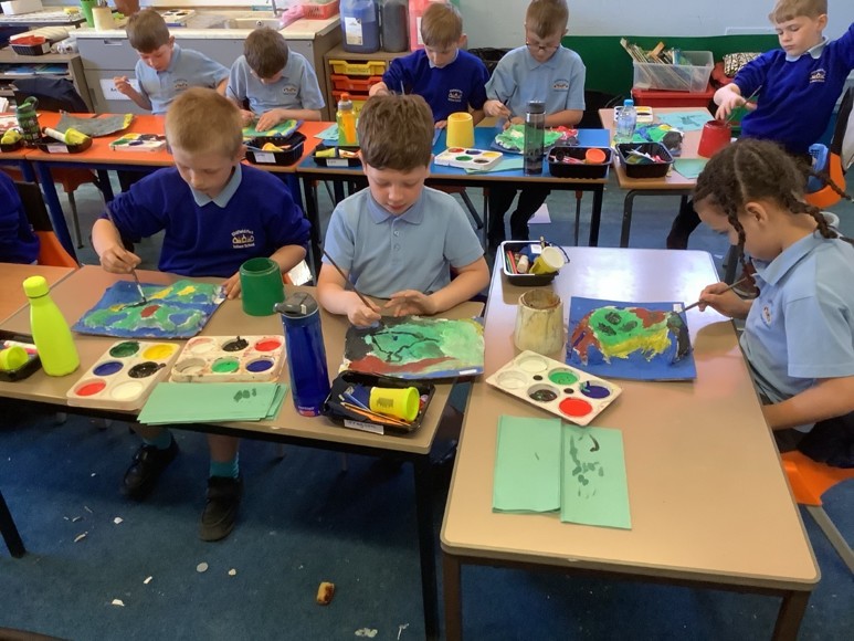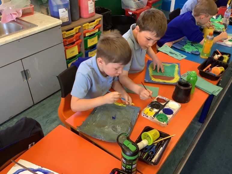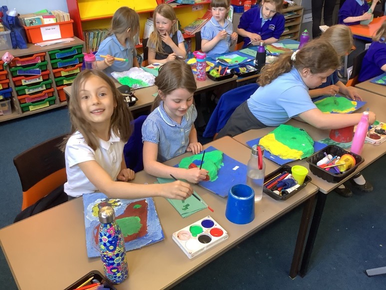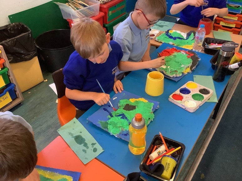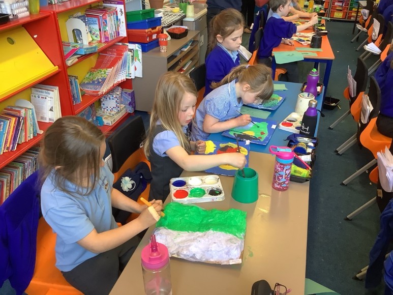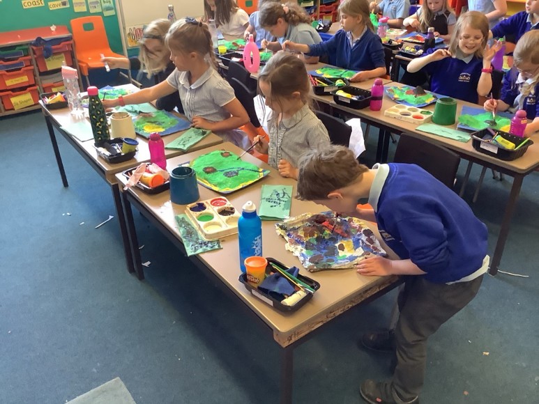 Over last term we planned and made our own islands using card, newspaper, tissue paper and lots and lots of pva glue. Over the Easter holiday the glue had dried and then we could paint them. The painting was a 2 stage process. The basic background colours of land, rocks, beaches and sea were done first and then we added the details the following week. They are now in display in the classroom and will be with you to keep at half term.