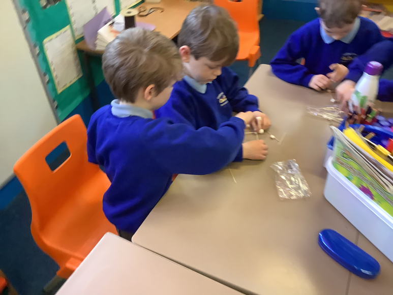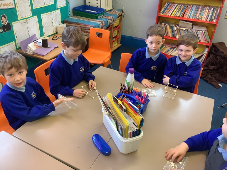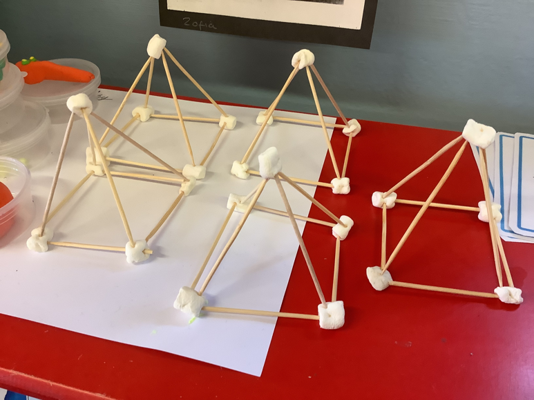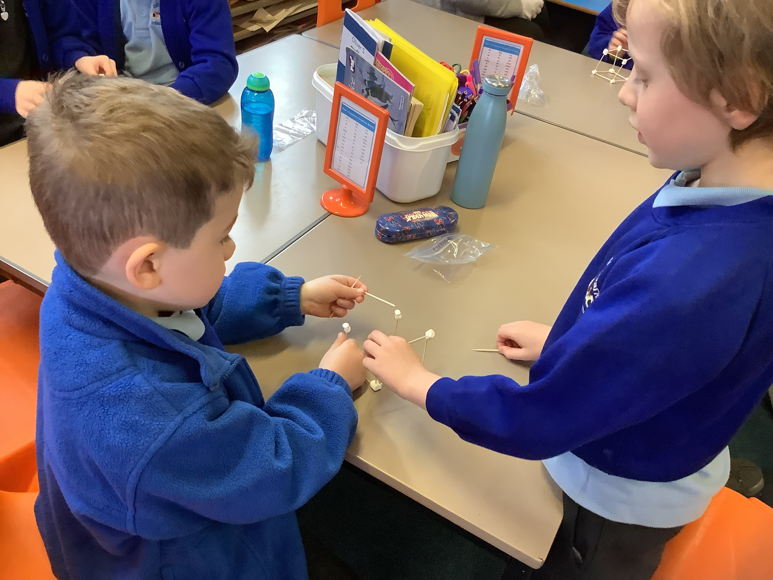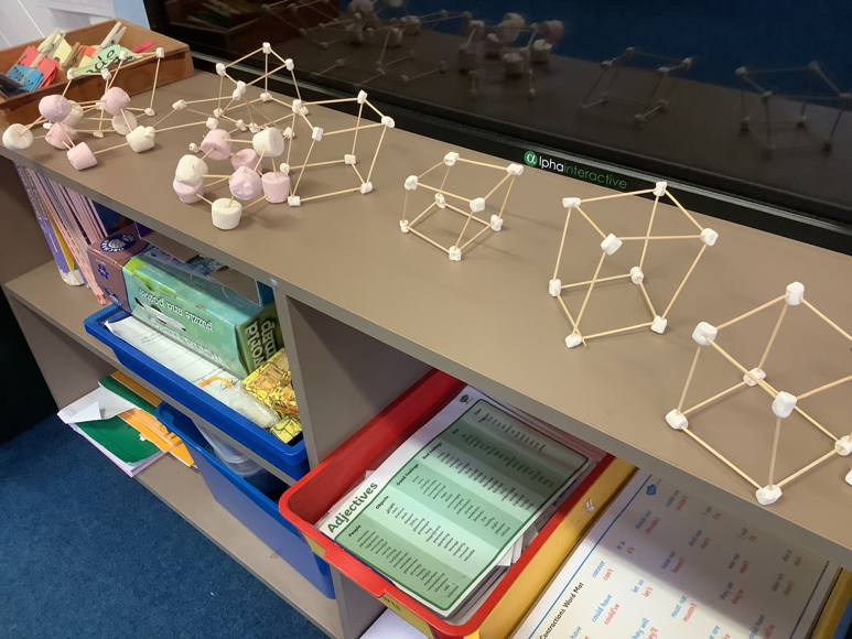 As part of learning about 3D shapes, Squirrel Class made their own 3D shapes using cocktail sticks and marshmallows. They had to work out how to fix the sticks and together with the marshmallows to make a range of shapes- cubes, cuboids and pyramids.