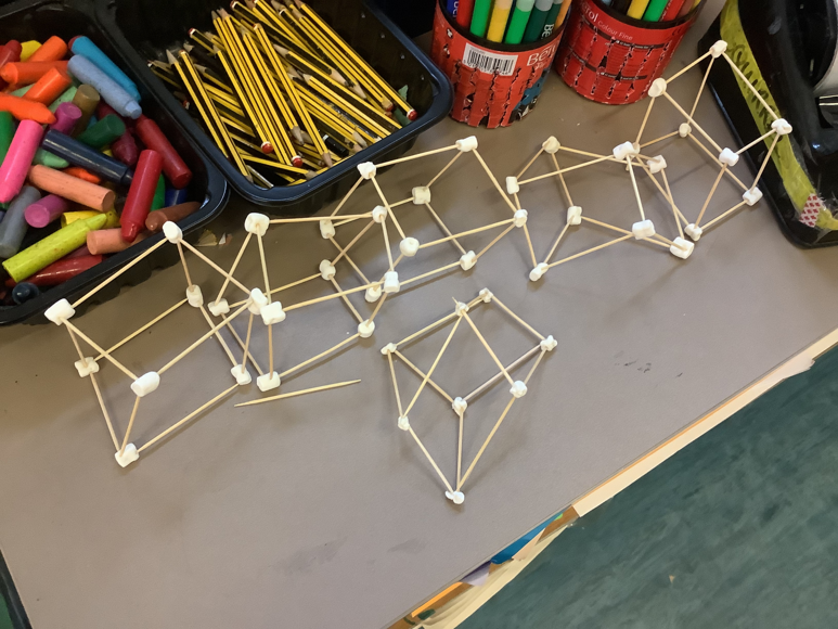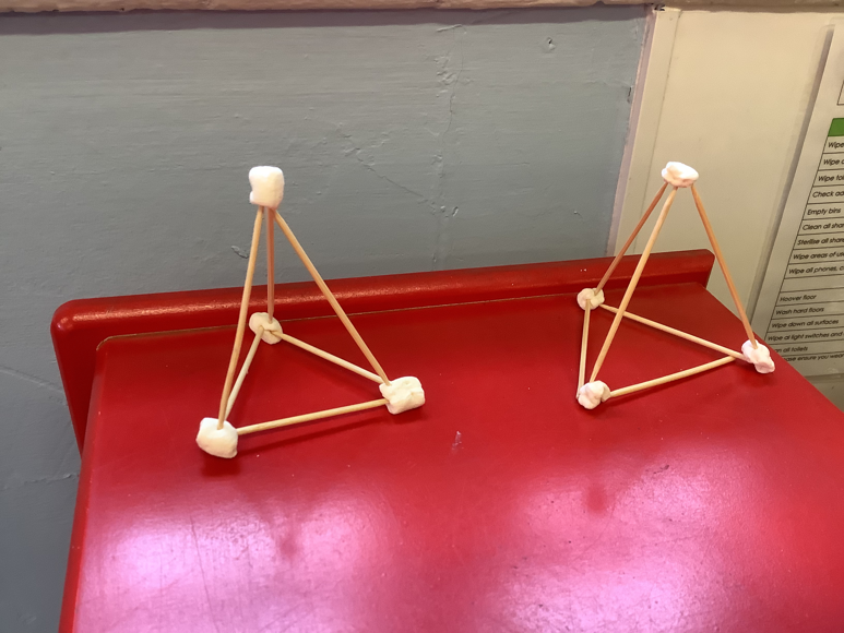 We then used this knowledge to work out how many sticks (edges) and how many marshmallows (vertices) each shape had.
