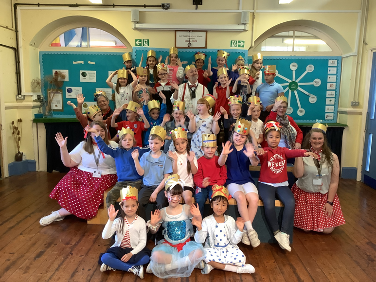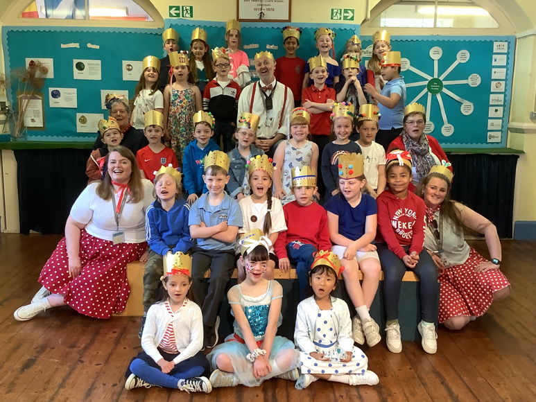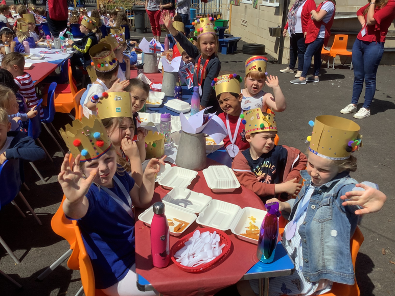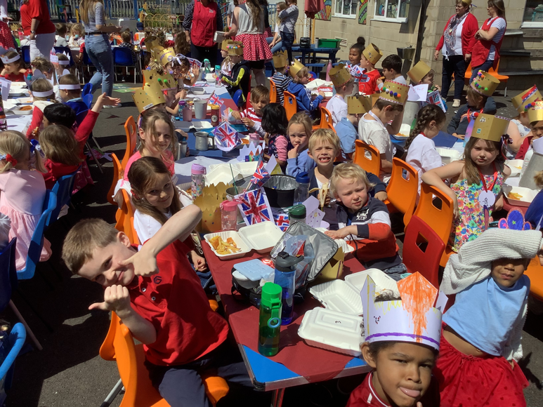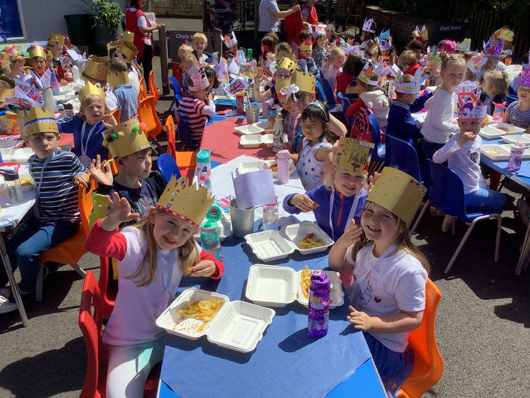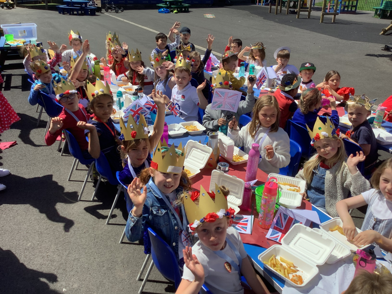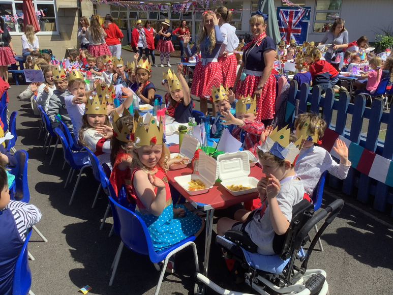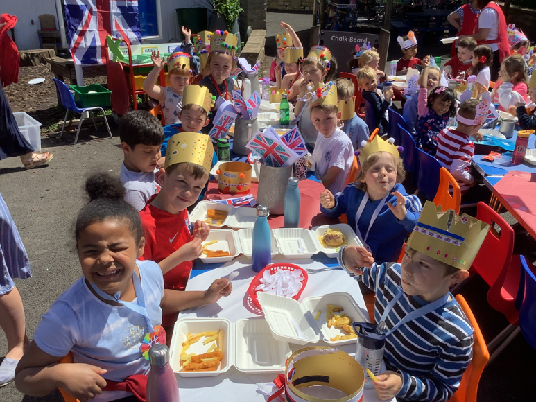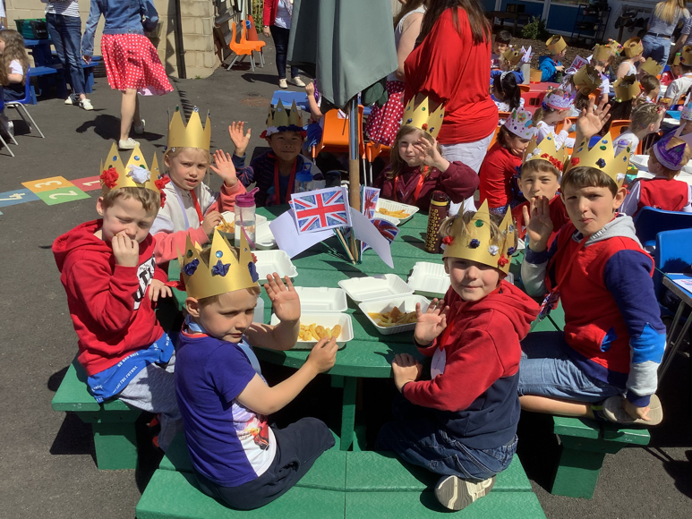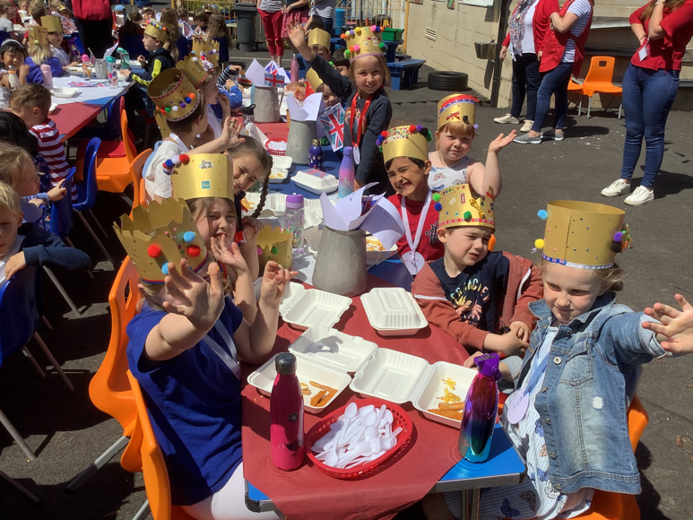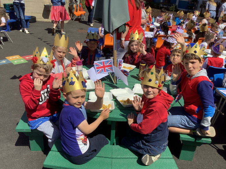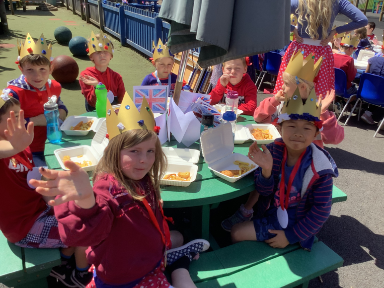 At lunch we had a school "street party" in the playground. Fish 'n' chips all round! The national anthem, "God Save The Queen" was sung before we started of course!